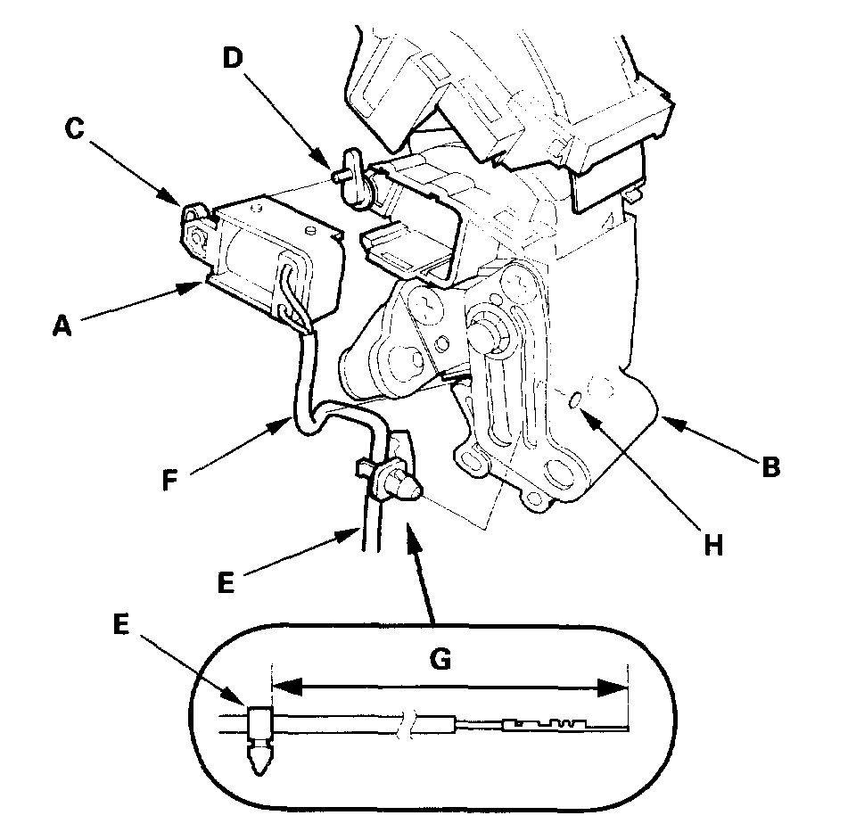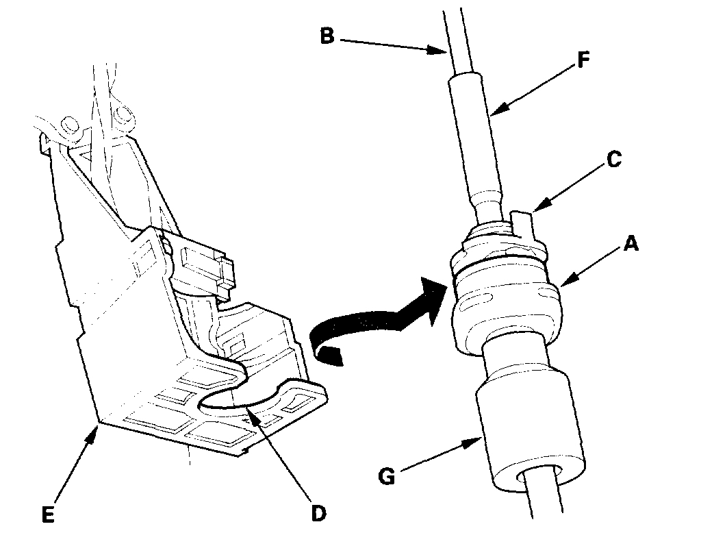 8. Rotate the socket holder (A) on the shift cable (B) a quarter turn; the tab (C) on the socket holder will be in the opening (D) of the shift cable bracket (E). Then slide the holder to remove the shift cable from the shift cable bracket. Do not remove the shift cable by twisting the shift cable guide (F) and damper (G).