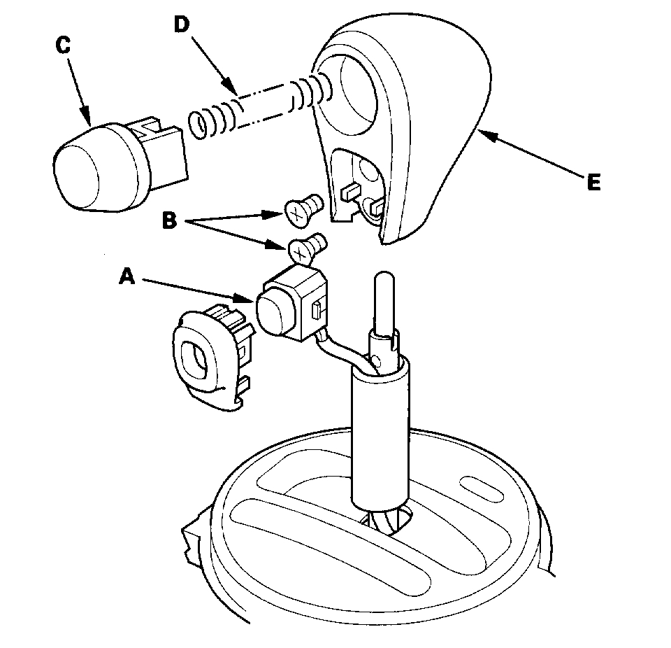 17. Remove the O/D switch (A) by expanding its locks, and remove the screws (B), shift lever button (C), spring (D), and shift lever knob (E).
