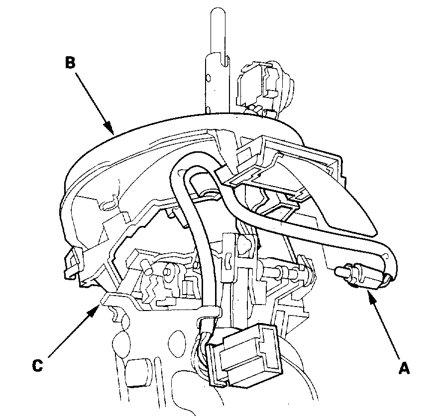 18. Remove the A/T gear position indicator panel light socket (A), then separate the A/T gear position indicator panel (B) from the shift lever bracket (C).