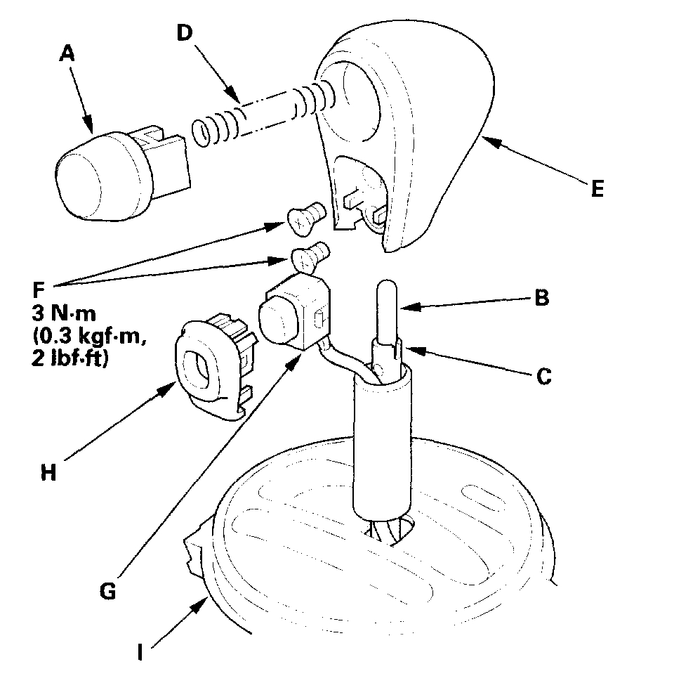 27. Install the O/D switch (G) and the O/D switch cover (H), and install the A/T gear position indicator panel (I) on the shift lever bracket.
