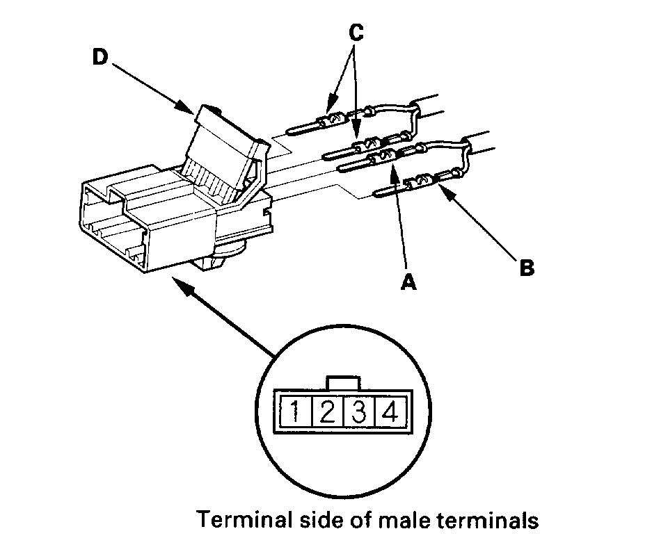 20. Remove the terminal (C) from the connector by pushing the lock tab (D) up in the connector using a thin blade screwdriver (E). Remove all four terminals.