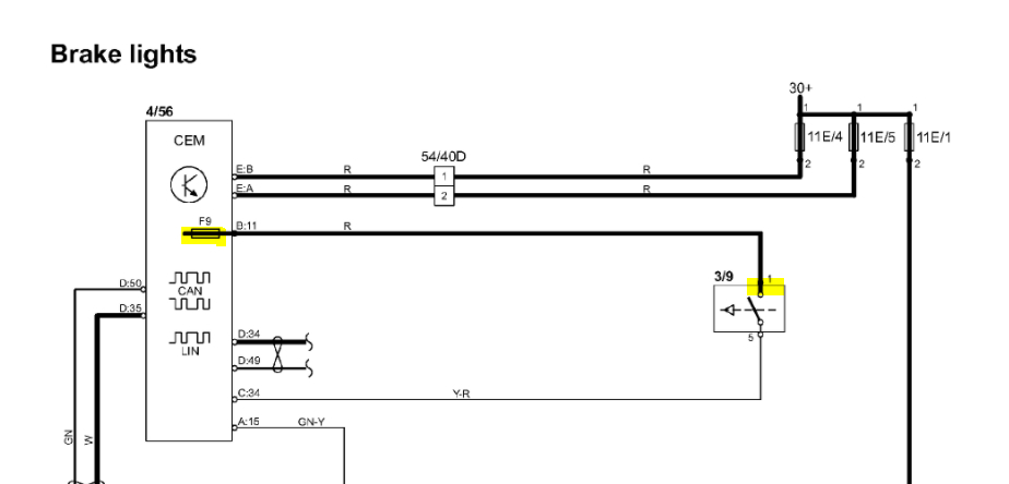 Using the below illustration of the wiring diagram you can also test the 2 wires from the brake light switch going back to the fuse box. The red wire supplies 12V from pin 11 at connector B to brake light switch pin 1 and the signal from the brake light switch comes from pin 5 at switch, yellow/red wire, to pin 34 at connector C. How to test a wire please see below.