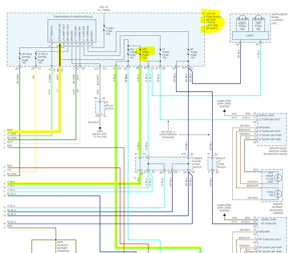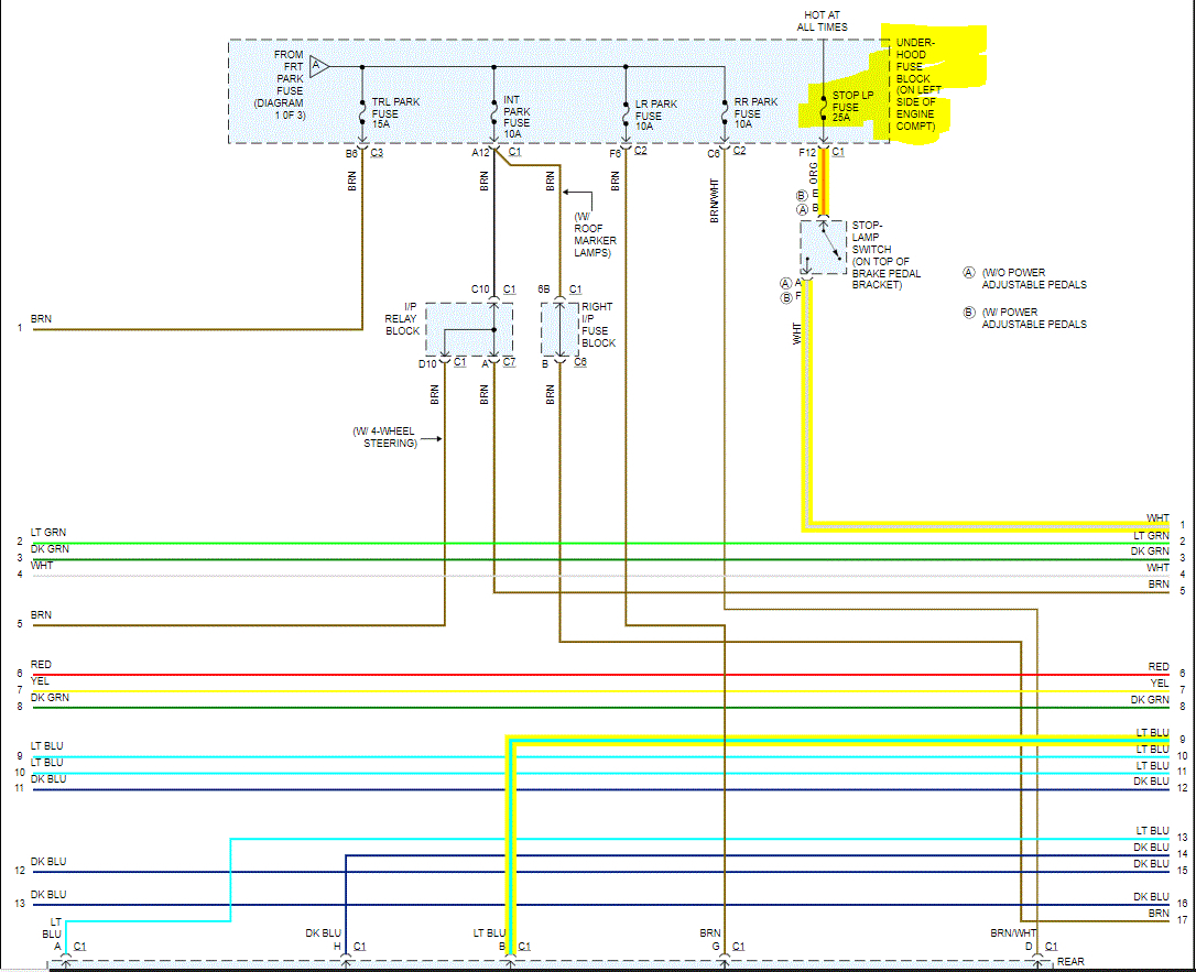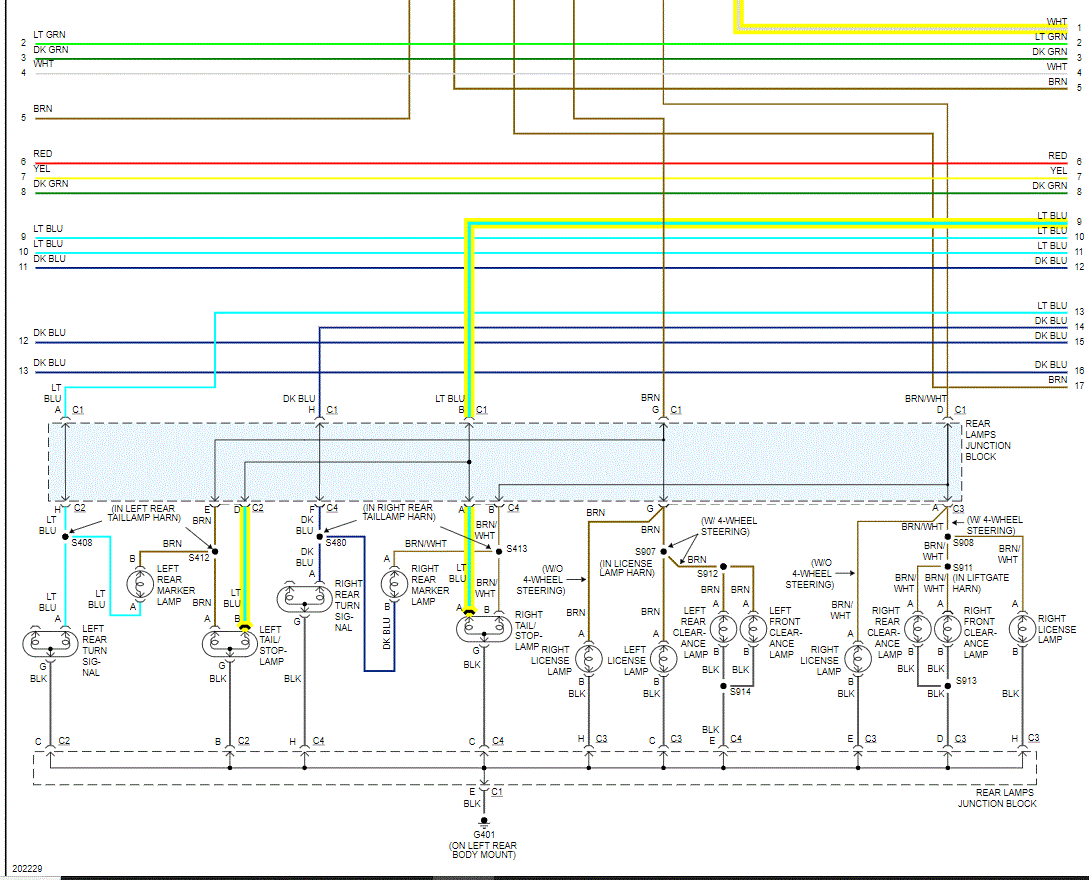 We certainly need those fixed. First, I attached the wiring schematics below of the entire exterior lighting system. I had to cut each pic in half to make it readable for you, but I did overlap them so you can follow from one to the next. Additionally, I highlighted the wiring related to the brake lights.