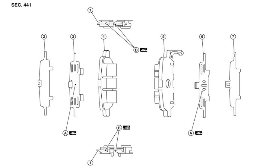 Apply Molykote AS-880N grease or equivalent between the outer brake pad, outer shim cover and outer shim and the inner shim and inner brake pad. Install outer shim, outer shim cover to outer brake pad, and inner shim, inner shim cover to inner brake pad.