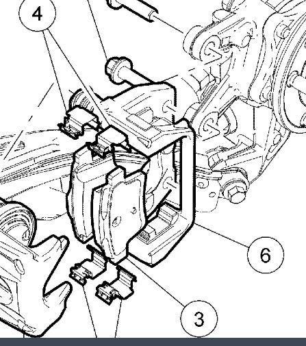 7. Remove and discard the brake pads and spring clips from the brake caliper anchor plate.