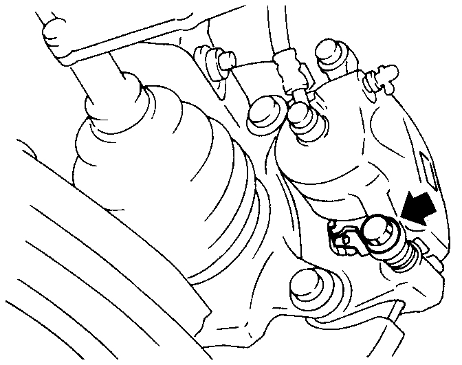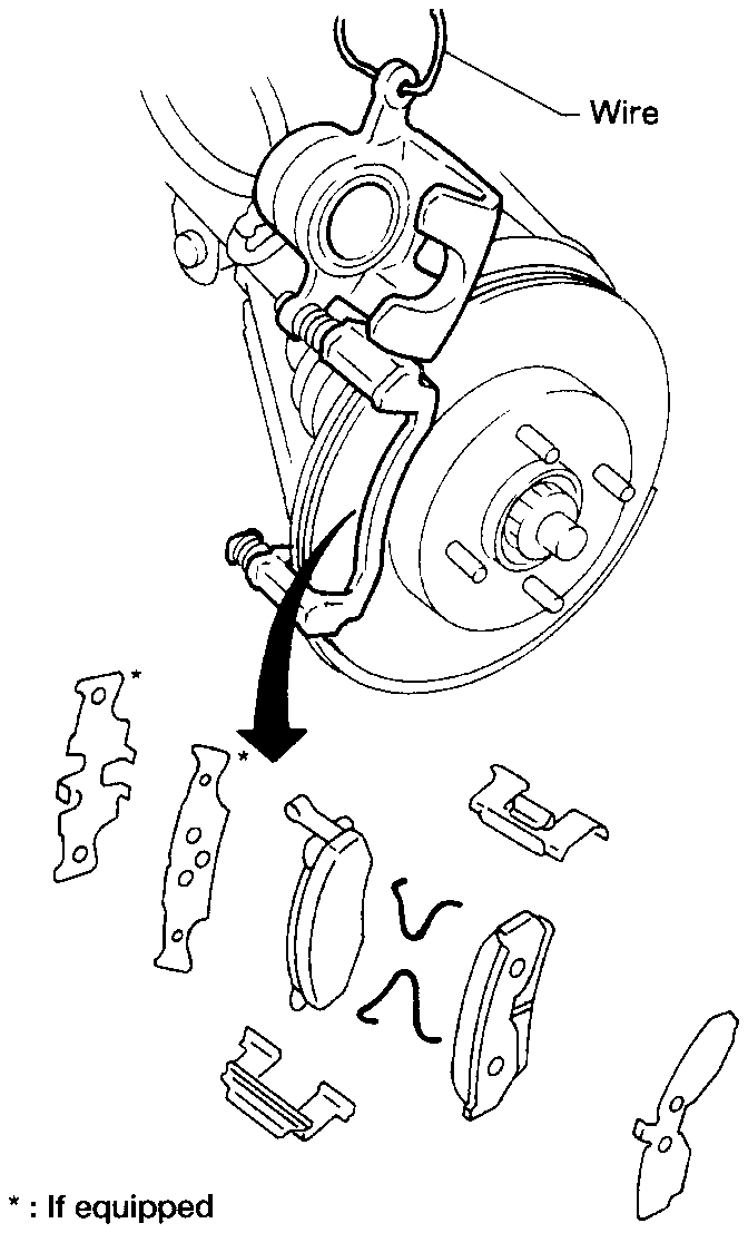 3. Rotate caliper body upward and suspend caliper assembly with wire so as not to stretch brake hose.