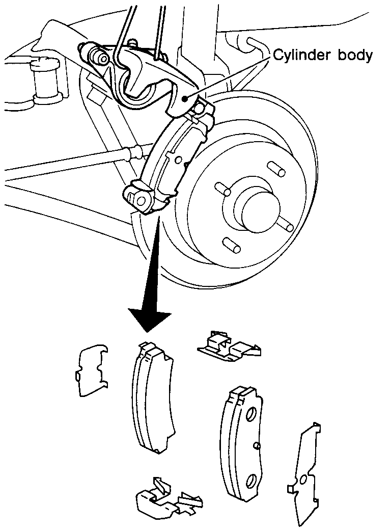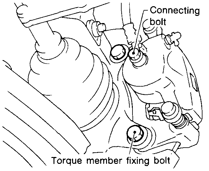 It is not necessary to remove connecting bolt except for disassembly or replacement of caliper assembly. In this case, suspend cylinder body with wire so as not to stretch brake hose.