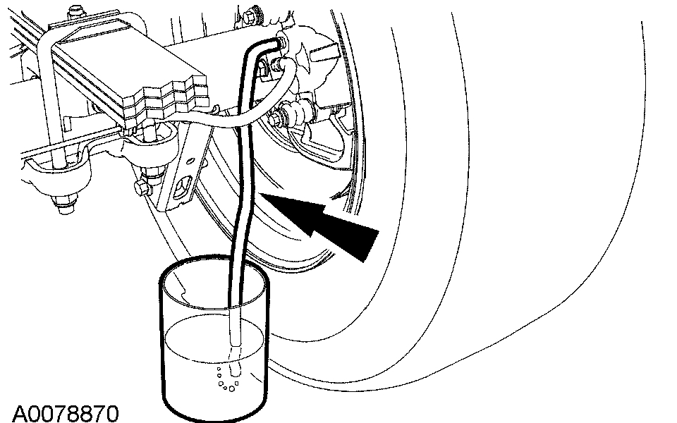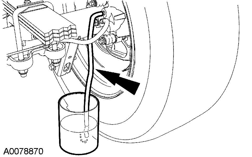 2. Connect a clear hose to the RH rear disc brake caliper bleeder screw and place the other end into a container partially filled with clean, specified brake fluid.