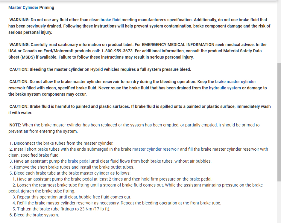 Ford products often have four steel lines coming out of the master cylinder. That makes it impossible to bend all of them upward, but the rest of the procedure still works. With the new master cylinder installed, loosen one of the line nuts about half a turn, then have a helper slowly push the brake pedal no more than half way to the floor. The new master cylinder won't be damaged by pushing the pedal too far because no corrosion has built up in it yet, but it's a good practice to have your helper get used to. Snug the line nut, then holler to your helper to quickly release the pedal. Loosen the nut again, then have him push the pedal slowly again. It should take about 15 seconds to push the pedal half way to the floor. If you still see any air bubbles sneaking out, do that a third time. Repeat the procedure for each of the other lines.