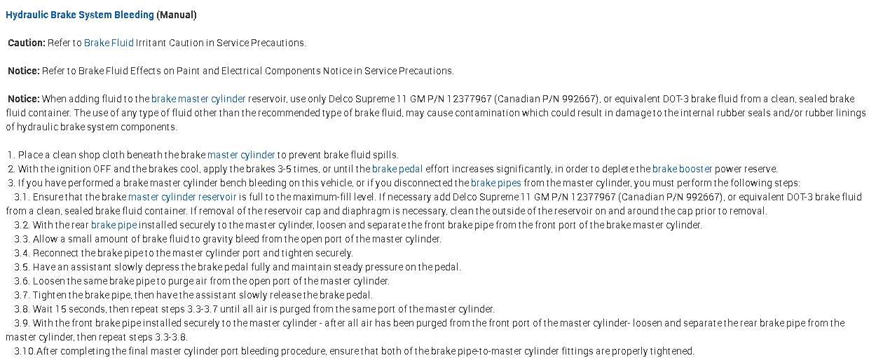 There is one more thing worth mentioning, but I do not know if it applies to this vehicle. This applies to only GM front-wheel-drive cars, not any other brand I'm aware of. When you try to pedal-bleed with a helper, the first bleeder screw you open will trip a valve inside the master cylinder as soon as the pedal is pushed. From that point on, you will not get any fluid to flow from that wheel or the one in the opposite corner. If the left front won't flow any fluid, the right rear will also not flow. You typically have to press the brake pedal more than half way to the floor to trip that valve. There are misinformed people who still think tripping that valve can be avoided by bleeding the wheels in a specific sequence, but that is not true. This feature prevents total loss of brake fluid in the event of an external leak, such as a ruptured rubber flex hose. It wouldn't make sense to say to start with the right rear wheel because who knows which hose will pop first? If the right rear hose ruptures, you better hope that valve trips to stop fluid loss. That valve does not know the difference between someone bleeding the system or a leak. No matter which wheel you start with, that valve is going to trip. A lot of do-it-yourselfers replace the master cylinder for that failure to flow fluid to two wheels, then have the same problem with the new one after pedal-bleeding again. I only use gravity-bleeding. It doesn't take too much longer, and it avoids this problem. Some mechanics like to start with the rear wheels to get as much air out as possible on the first one. Some like to start with a front wheel because being such short lines, it takes very little effort to get one line fully bled. In doing major brake work since the mid 1980's, when bleeding is necessary, I always start with the wheel I'm standing closest to.