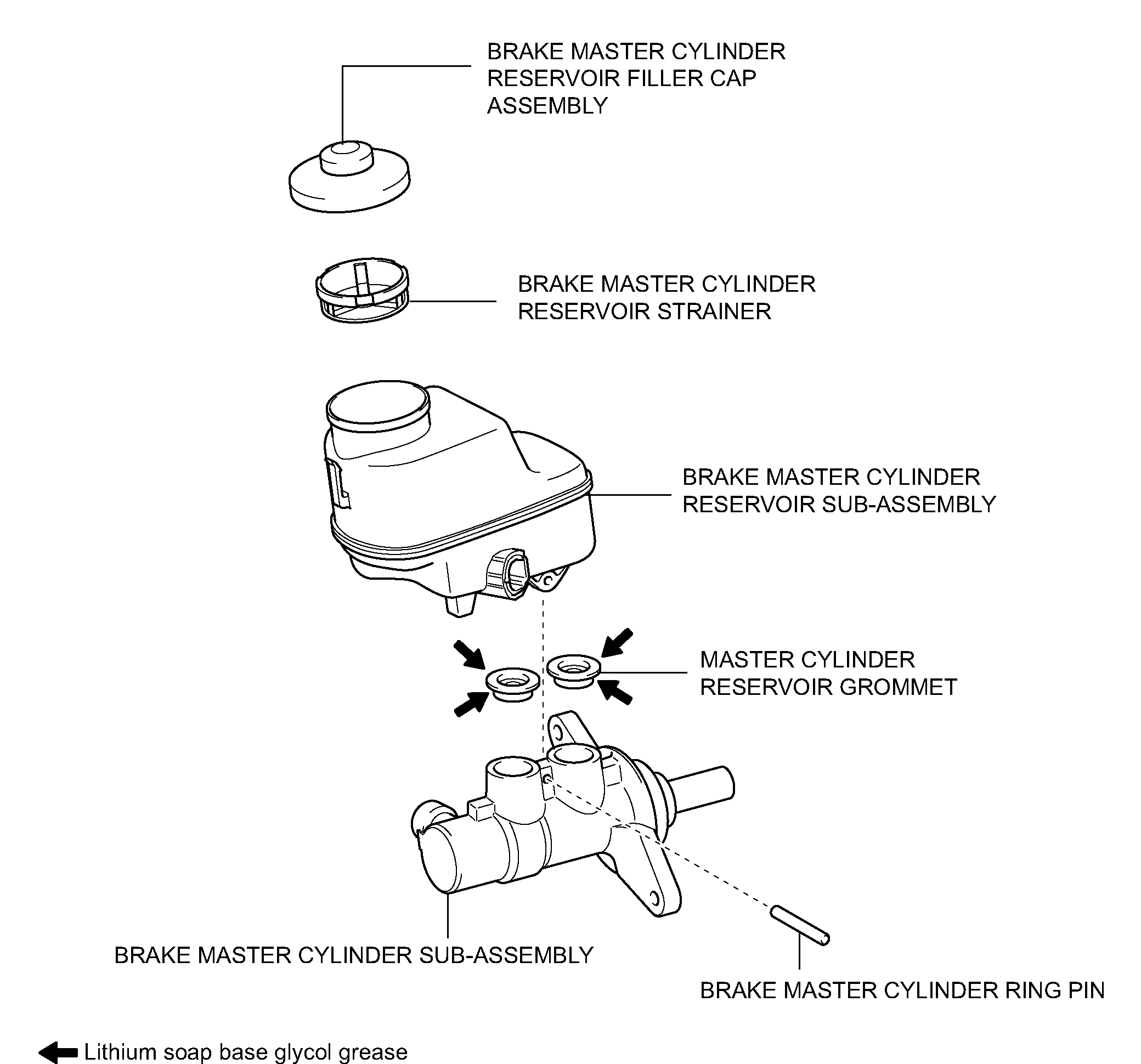 Make sure foreign matter does not attach to the master cylinder's piston. If foreign matter attaches, clean it off with a cloth. Then apply lithium soap base glycol grease to the entire outer circumference contact surface area of the piston.