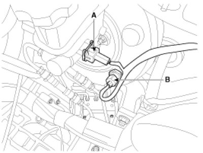 3. Disconnect the brake fluid level switch connector (A), and vacuum switch connector (B).