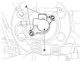 6. Remove the master cylinder (B) from the brake booster after loosening the mounting nuts (A).