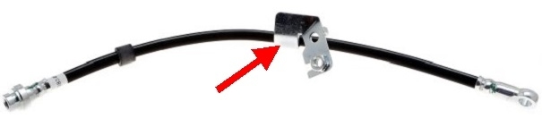 What happens is water gets inside the crimp where the metal bracket is attached to the hose, (red arrow). Rust develops and constricts the hose as it builds up. You can force brake fluid through the restriction to apply the brakes, then the trapped fluid can't return to the reservoir. The dragging brake generates excessive heat which migrates into the brake fluid. That heat makes the fluid expand and apply the brake even harder until the vehicle won't move, or that brake will be smoking if you force the vehicle to keep moving.