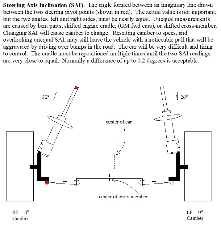 As a side note for caster, the majority of front-wheel-drive cars are completely immune to pulling to one side due to unequal caster. I can't offer an explanation for that, but I've had as much as 3.0 degrees difference, and there was no pull. With that much difference on a rear-wheel-drive car, you'd have to hold onto the steering wheel with both hands to keep it going straight. Many of those front-wheel-drive models, particularly imports, don't even provide a means of adjusting caster. You just take what you got and move on.