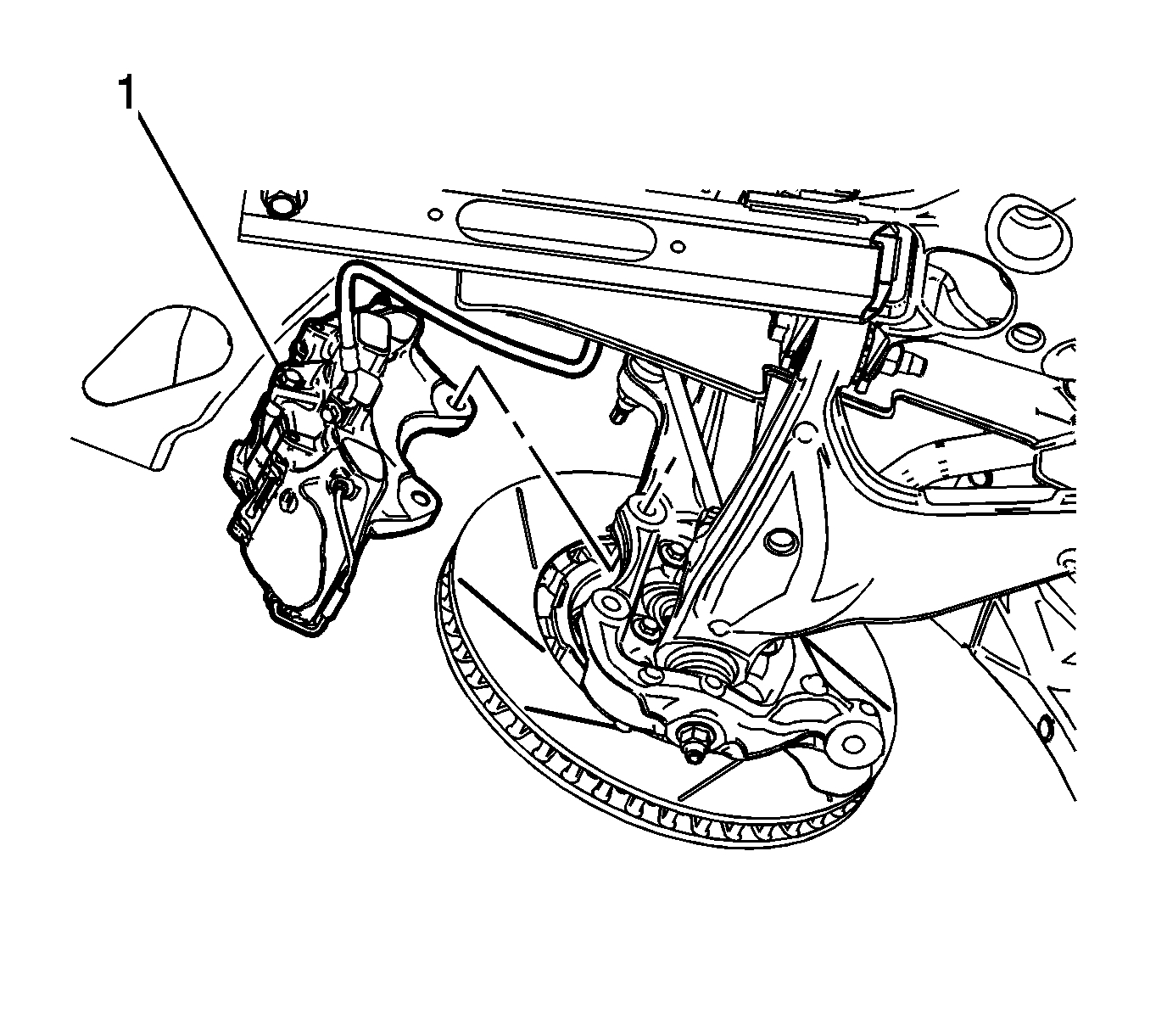 Caution: Support the brake caliper with heavy mechanic wire, or equivalent, whenever it is separated from its mount and the hydraulic flexible brake hose is still connected. Failure to support the caliper in this manner will cause the flexible brake hose to bear the weight of the caliper, which may cause damage to the brake hose and in turn may cause a brake fluid leak.