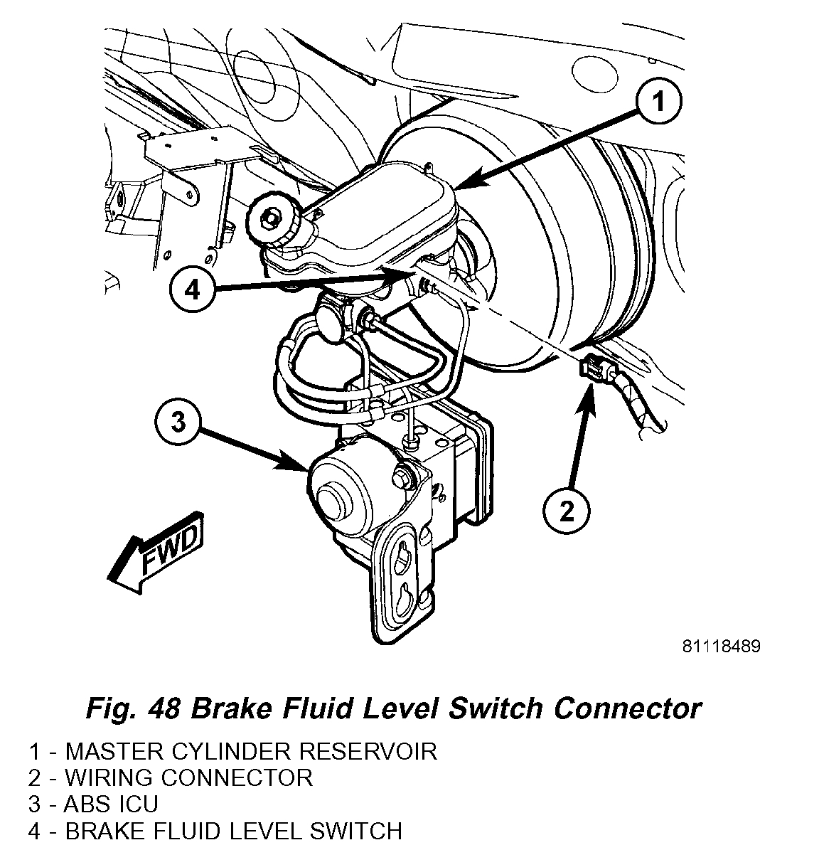 4) Disconnect wiring harness connector from brake fluid level switch in master cylinder brake fluid reservoir (Fig. 48).