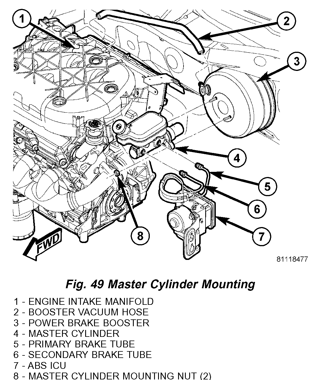 4) Install two master cylinder mounting nuts (Fig. 49). Tighten both mounting nuts to a torque of 25 Nm (225 inch lbs.).