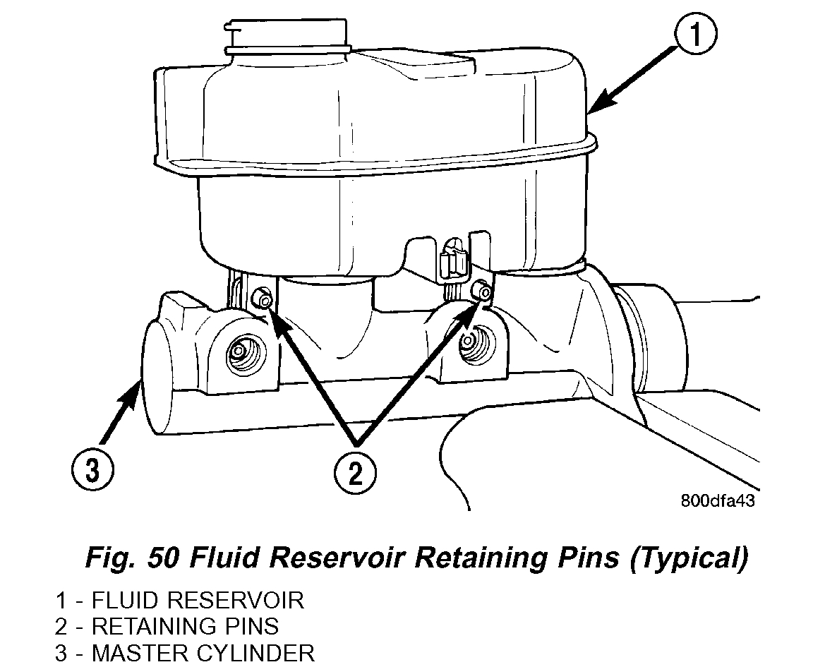 4) Install the two fluid reservoir to master cylinder retaining pins (Fig. 50).