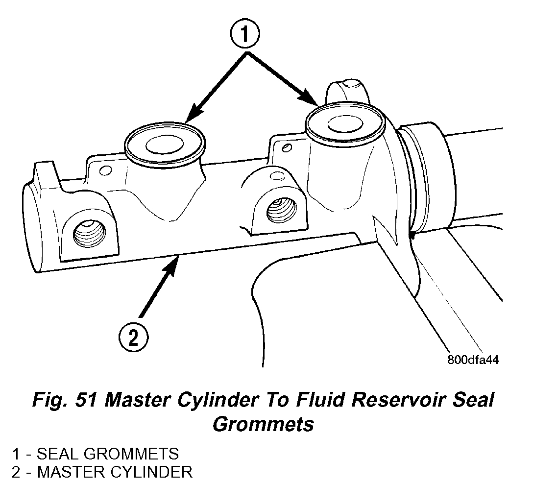 1) Install new master cylinder housing to brake fluid reservoir sealing grommets in master cylinder housing (Fig. 51).