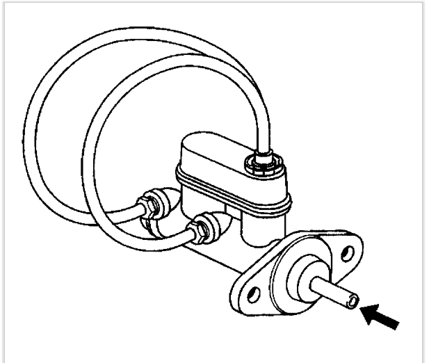 7. Using a smooth, round-ended tool, depress and release the primary piston as far as it will travel, a depth of about 25 mm (1 inch), several times. Observe the flow of fluid coming from the ports.