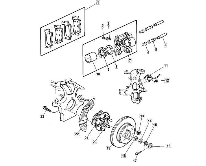 Brake mounting bracket - Doesn't have them, the caliper and pads slide on ears that are cast into the steering knuckle. It is held in place by the caliper pins.