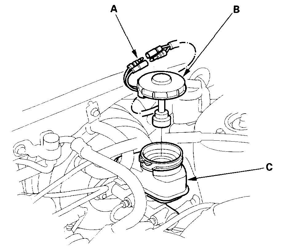 3. Disconnect the brake fluid level switch connectors (A), and remove the reservoir cap (B).