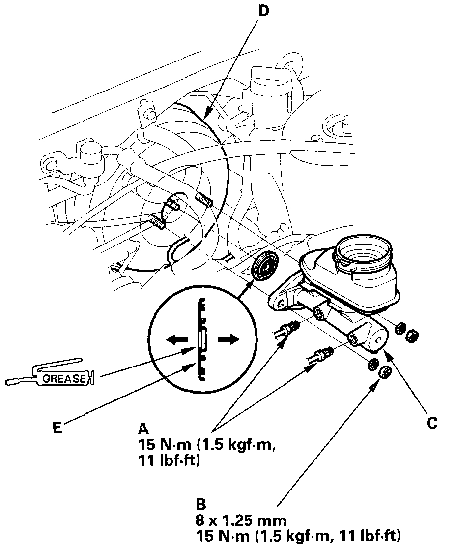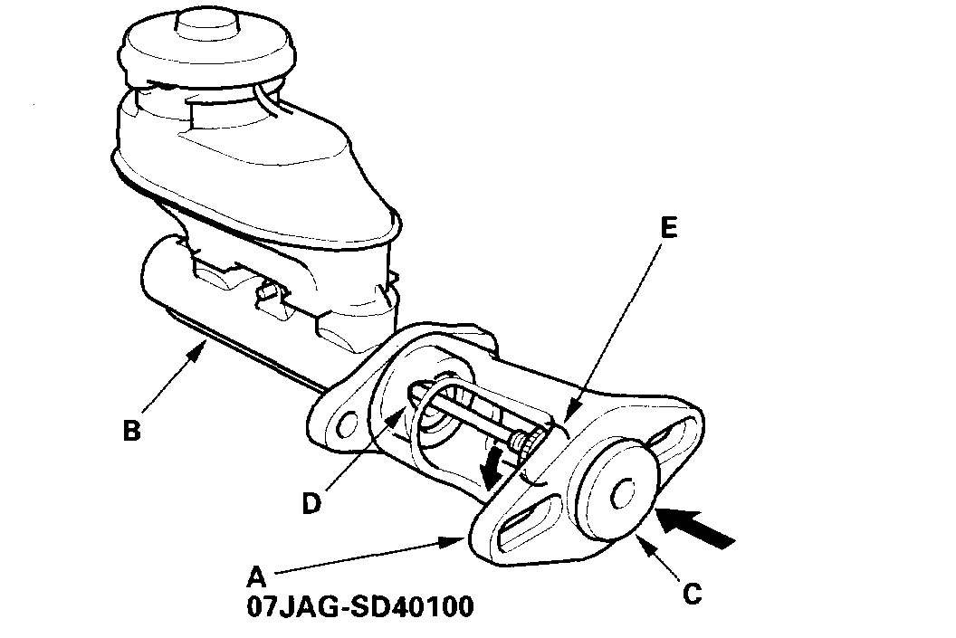 1. Set the special tool (A) on the master cylinder body (B), push in the center shaft (C) until the top of it contacts the end of the secondary piston (D) by turning the adjusting nut (E).
