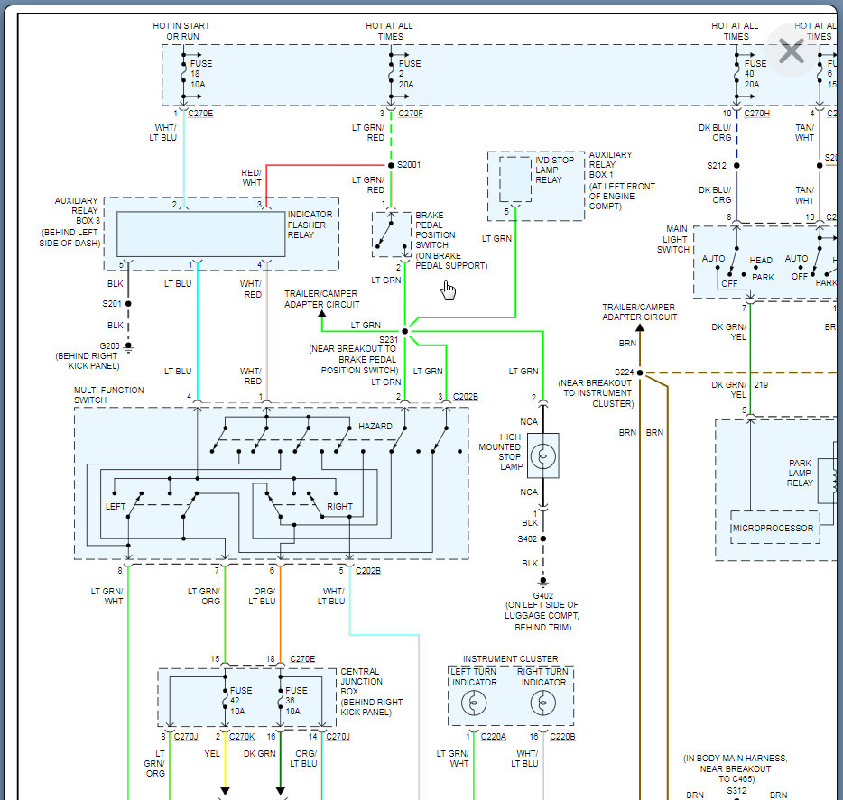 Do, take a look at pic 3. I need you to check for power to the brake light switch. There will be two wires on the switch. One is light green and one will be light green with a red tracer. The one with the tracer should have 12v at all time. Check to confirm there is power to that wire.