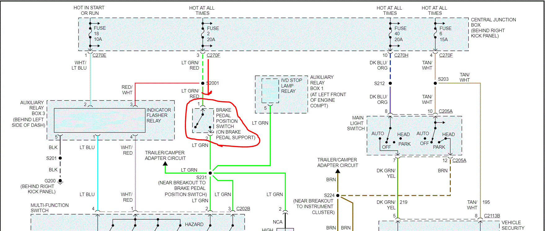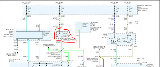 Now, I suspect the fuse that I mentioned is good simply because the flashers work. However, there is a splice between the fuse where power distributes to the flasher relay and the brake light switch above the brake pedal. So, if the flasher is working, the fuse is good, we either are losing power between the splice and switch or the switch is bad.