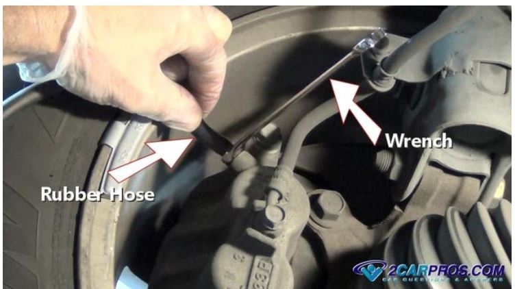 I have attached pictures from our site which are used to describe bleeding brakes. In your case, we just need to release the pressure at the caliper to see if that in turn releases the brakes.