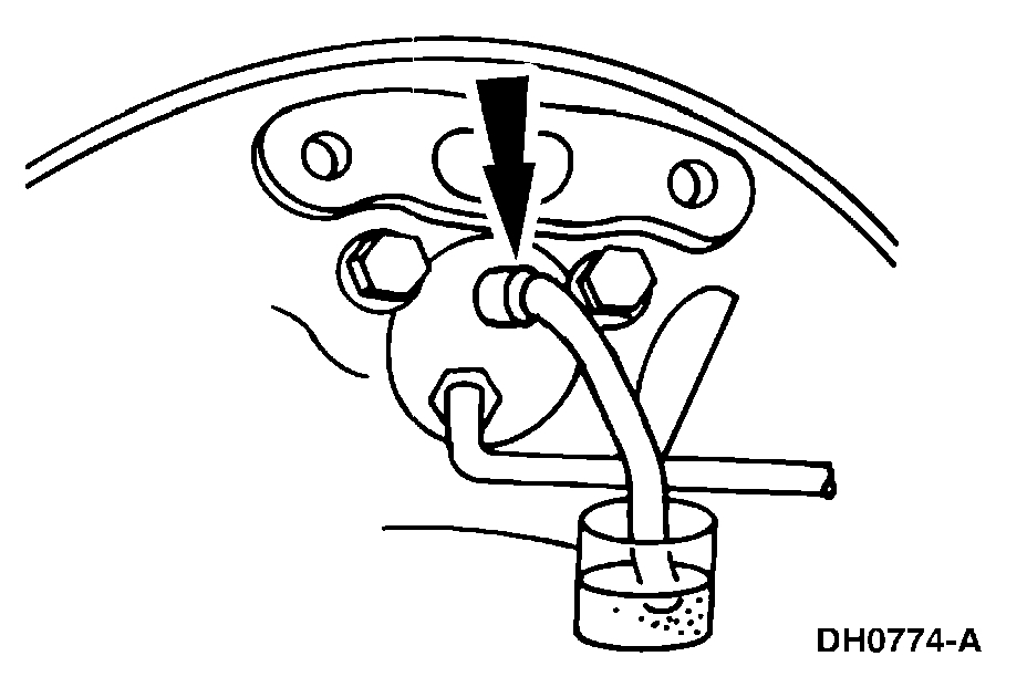 Place a box-end wrench on the RH rear bleeder screw. Attach a rubber drain tube to the RH rear bleeder screw, and submerge the free end of the tube in a container partially filled with clean brake fluid.