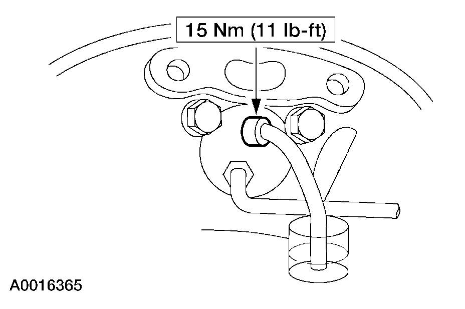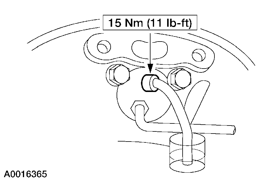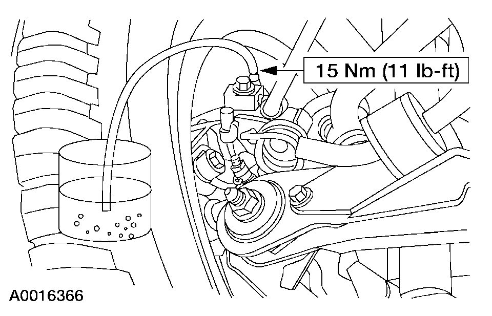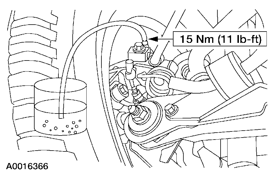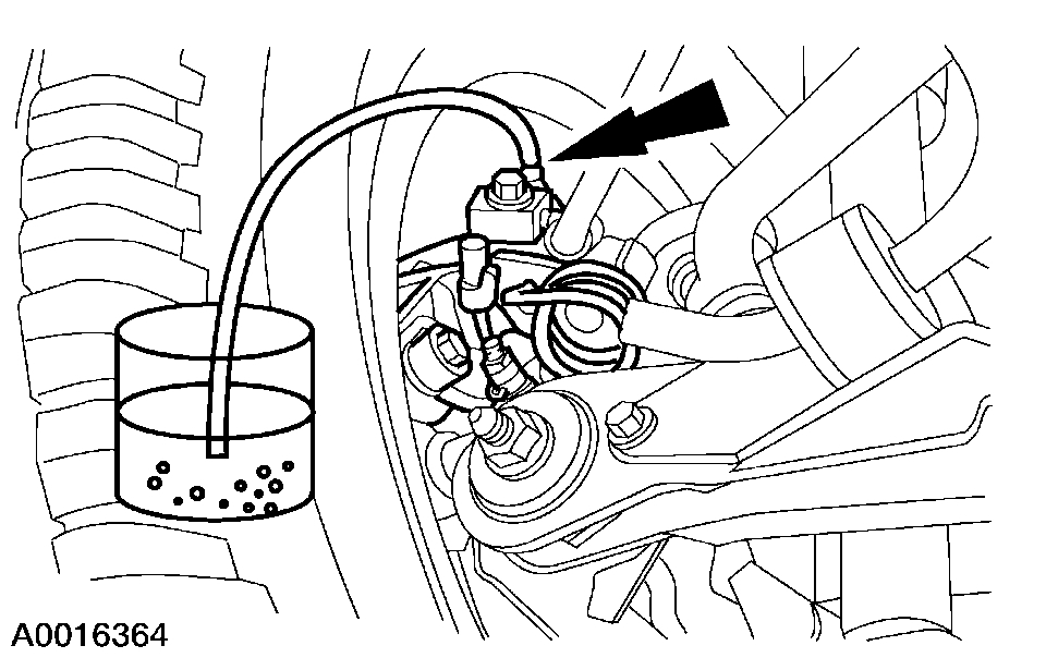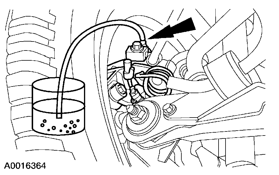 11. Loosen the RH front disc brake caliper bleeder screw until a stream of brake fluid comes out. While an assistant maintains pressure on the brake pedal, tighten the RH front disc brake caliper bleeder screw.
