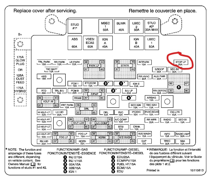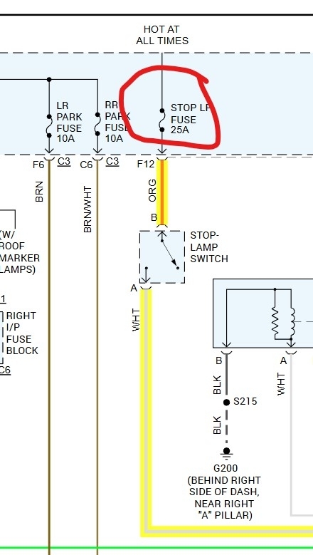 OK, the turn signals and brake lights share the same grounds so that isn't the issue. Do both marker lights work on each side? For the brake lights there are 3 fuses total. One is in the under hood fuse box, a 25 amp stop lamp fuse. It sends power to the stop lamp switch on the orange wire. When you step on the brakes it relays power to the white wire. The white wire feeds power back to the electronic flasher module in the interior fuse box and that then sends power out to the chmsl and stop fuses in the interior fuse box. Take a test light and check the fuse under the hood. Then hold the brake down and check the two fuses in the interior box. They only get power when the brake switch is depressed.