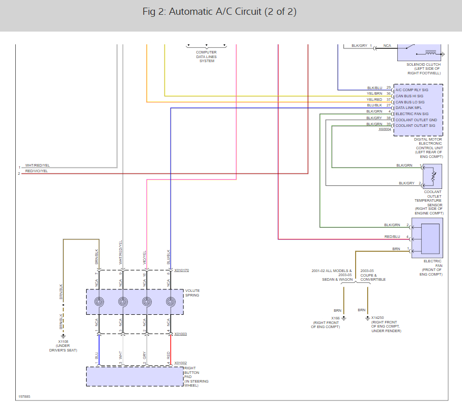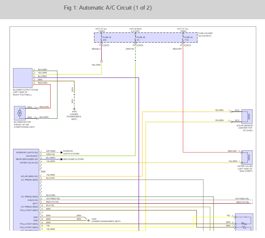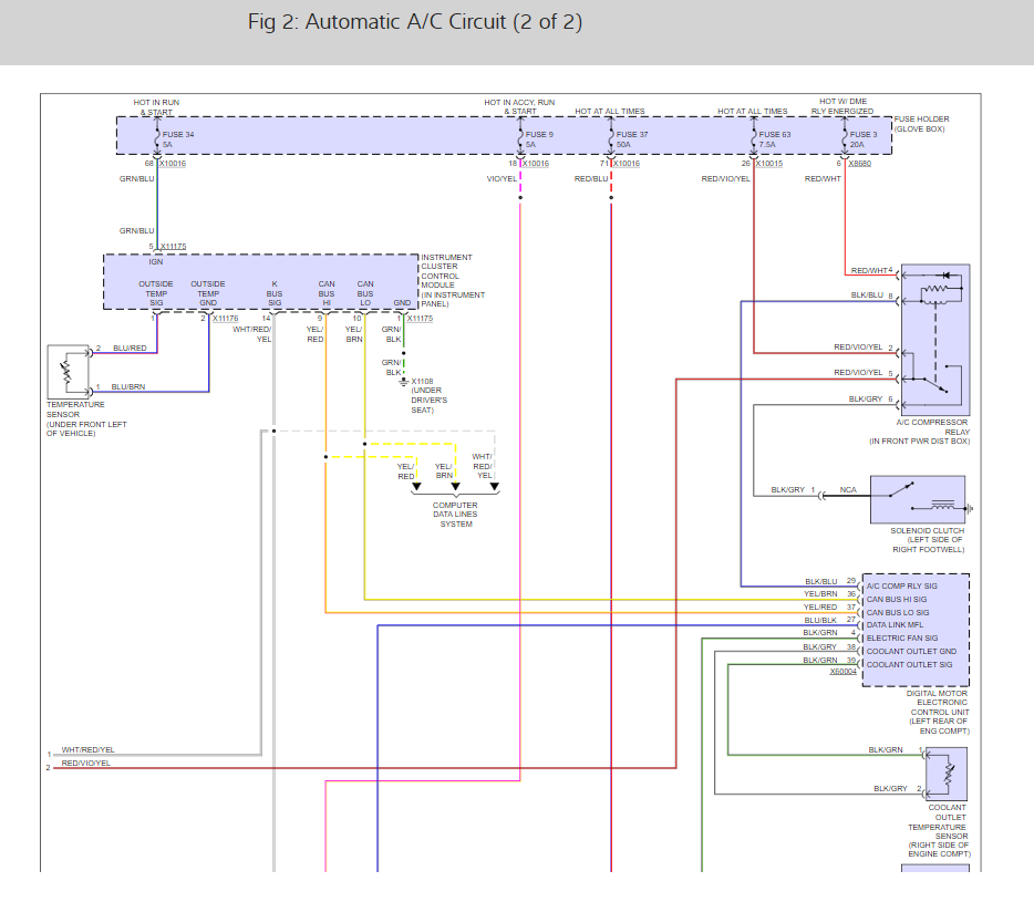 I have done a whole lot of trial and error with this situation, changing, coolant sensor, ambient temperature sensor, aux fan relay, compressor relays and to no avail, until I had my friend put on ac computer and the code that came up was solar sensor, I did loads of research and couldn't find much information because apparently these do not go bad very often. I even had BMW try and diagnose, and they couldn't figure it out.
