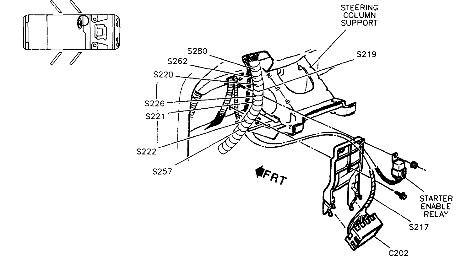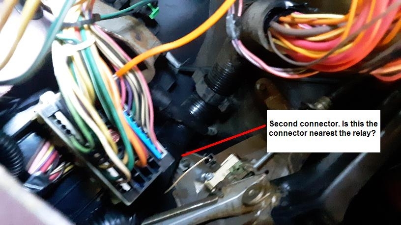 3. Thank you for additional information. What still puzzles me is which electrical connector you mean-- the specific location is still elusive. I expected to find a starter relay module in clear view, near the steering column. The diagram specifically positions the relay to the left of the steering column support. Tomorrow, if I can, I'll try another series of photos, to show you where my search is focused.