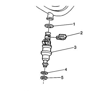 The fuel injector lower O-ring (5) uses a nylon collar, called the O-ring backup (4), to properly position the O-ring on the fuel injector. Be sure to reinstall the O-ring backup, or the sealing O-ring may move on the fuel injector when installing the fuel rail. If the sealing O-ring is not seated properly, a vacuum leak is possible and driveability complaints may occur.