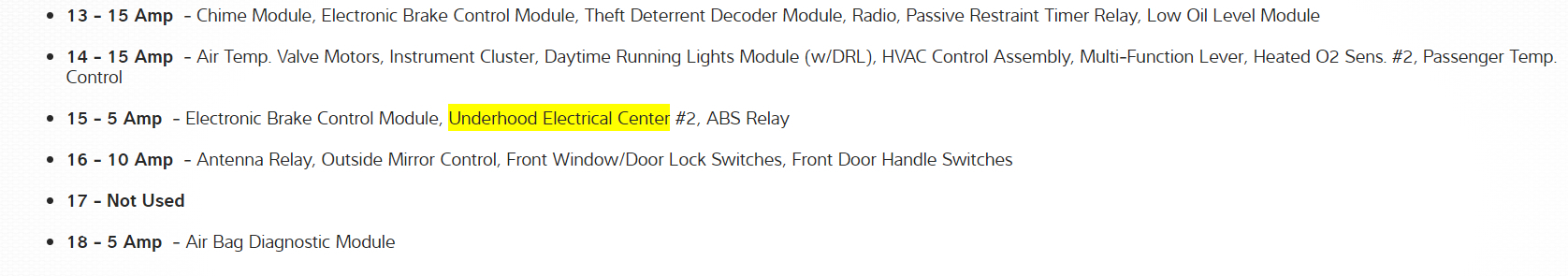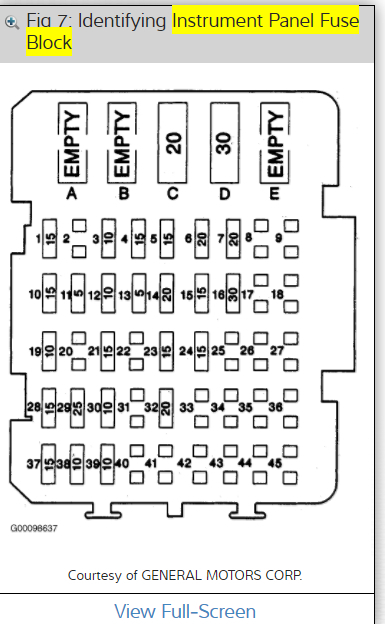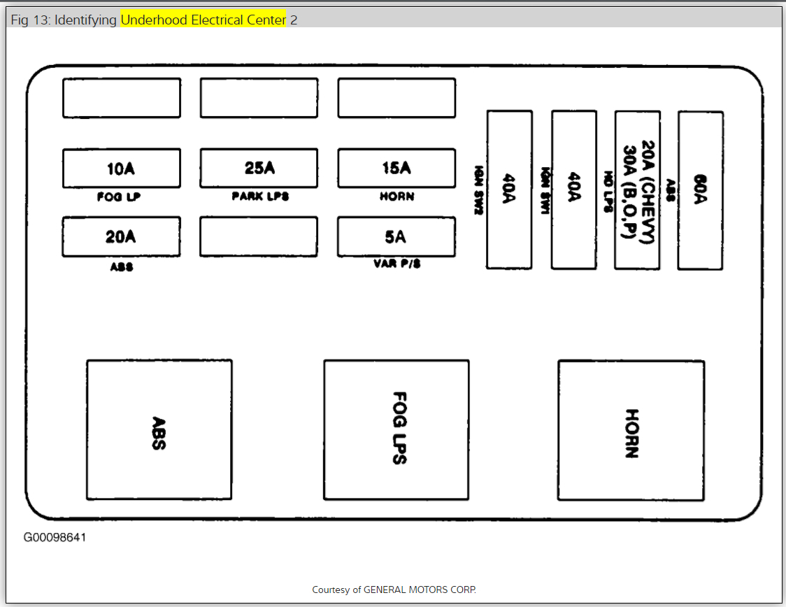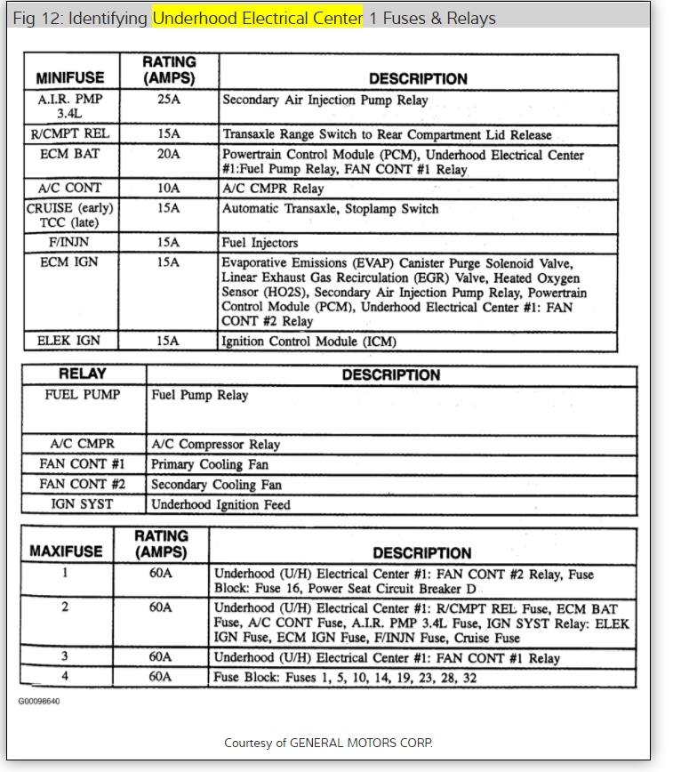 Cooling fan motor relay number 1 isl ocated in the underhood electrical center, pictured below..