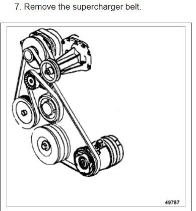 NOTE: This engine uses two accessory drive belts. The outer belt drives the supercharger. The inner belt drives the generator, power steering pump, coolant pump and air conditioning compressor. All driven accessories are rigidly mounted to the engine. Drive belt tension is maintained by the spring loaded belt tensioners. Each belt has its own tensioner.