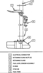 5.Remove fuel level sender assembly attaching nuts (6), retaining flag, sender assembly and O-ring from fuel tank. Lift assembly from the fuel tank.