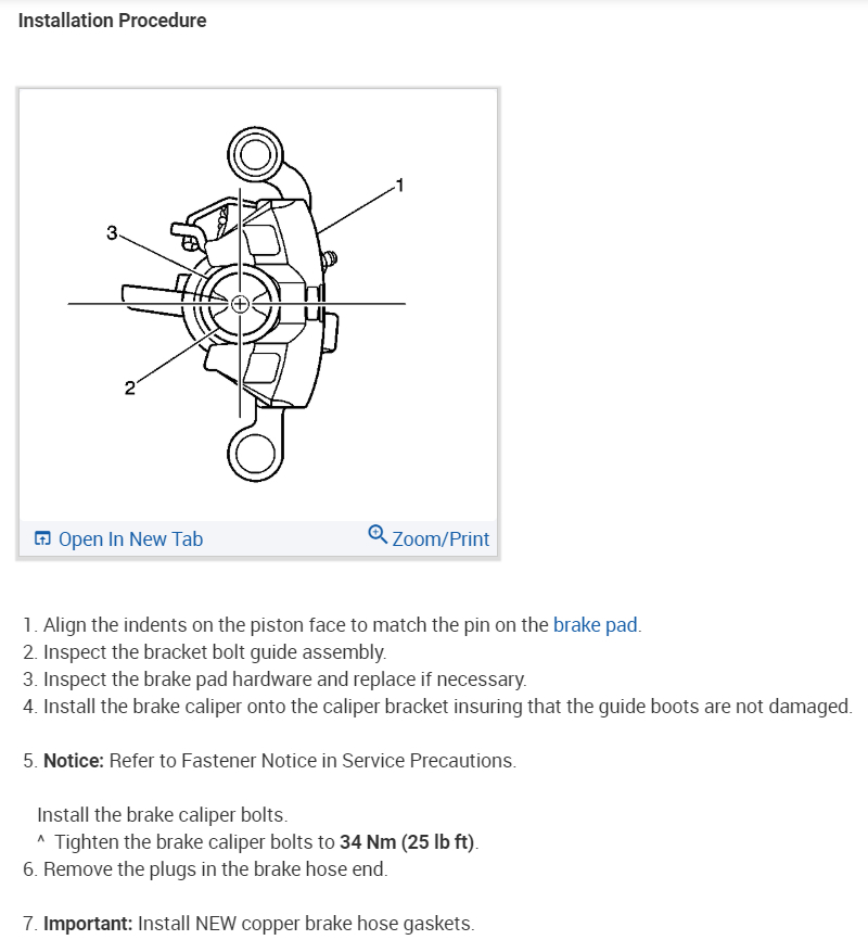 Now, it only indicates to depress the piston enough to remove the caliper. Once the caliper is off, place an old brake pad on the piston and using the C clamp, depress the caliper piston fully in. I always suggest removing the master cylinder cap, but keep in mind, if the MC is already full, depressing the caliper will cause fluid to leak from the top of the MC.