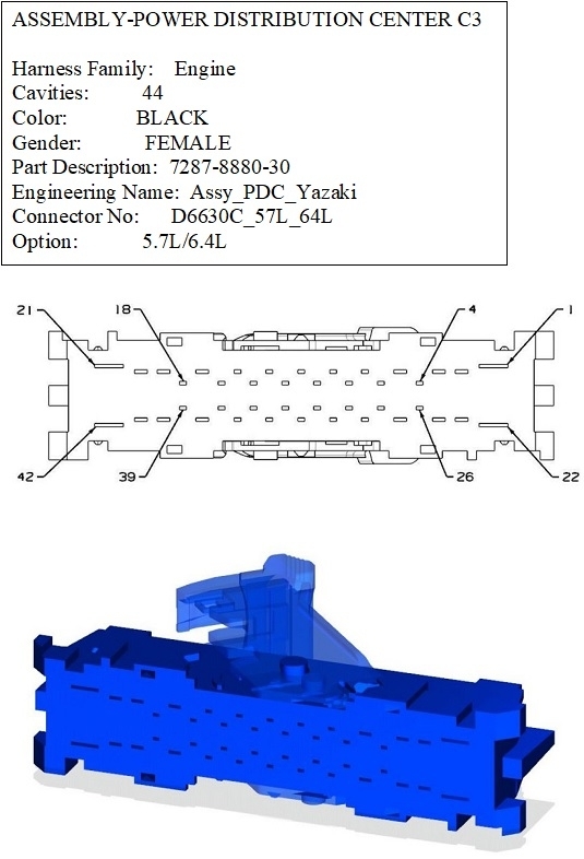 Now, if you look at my nifty arrows in the diagram below, this is the aftermarket version, but it follows many of the same designations. This is a small section of the Integrated Power Module, (IPM), you're working on. The red arrow is pointing to the wire I used for my example. It's for terminal # 1 in connector C3. Just to the right of it they show terminal # 26. The dashed line, (blue arrow), between pins 1 and 26 show that they're both in the same connector, C3 in this case.