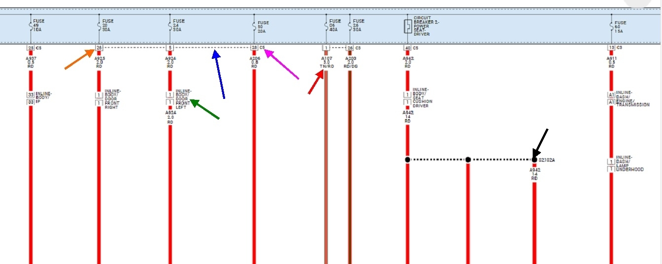 Some information is lost when you go to these aftermarket diagrams, but they make some things easier. The second example of this is they put entire circuits on one diagram here. I only posted a small, expanded section of one diagram below so I could point some things out. When you use a diagram right from Chrysler, the confusing part is it will cover many "sheets", and where a wire comes to an unexpected end, it will say which sheet number it is continued on. That's because when they draw these up, they may have hundreds of sheets laid out, but they don't know which page number each sheet will end up on when it goes to the printer. Page numbers might not even be shown in the paper manuals. Sheet numbers are on the top or bottom corners of the pages