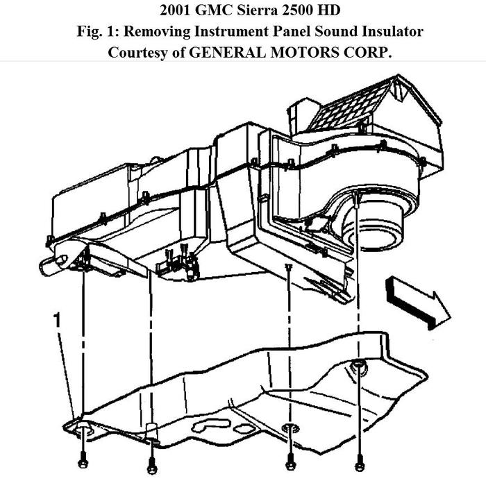 1. Remove the instrument panel sound insulator from under right side of instrument panel. See Fig. 1. Remove the retaining bolts. Remove the insulator (1) from the HVAC module by pulling downwards.
