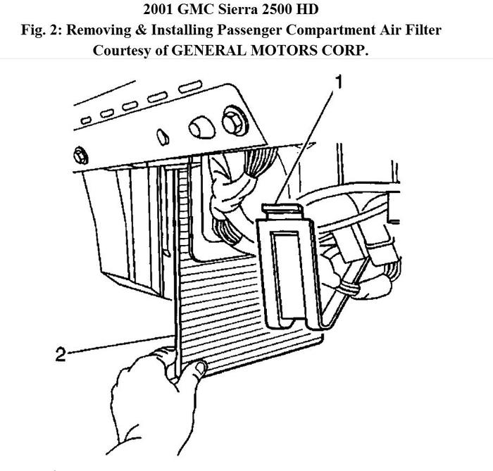 2. Remove the filter access door screw. Remove the filter access door (1) from the HVAC module. Remove both passenger compartment air filters (2). See Fig. 2.
