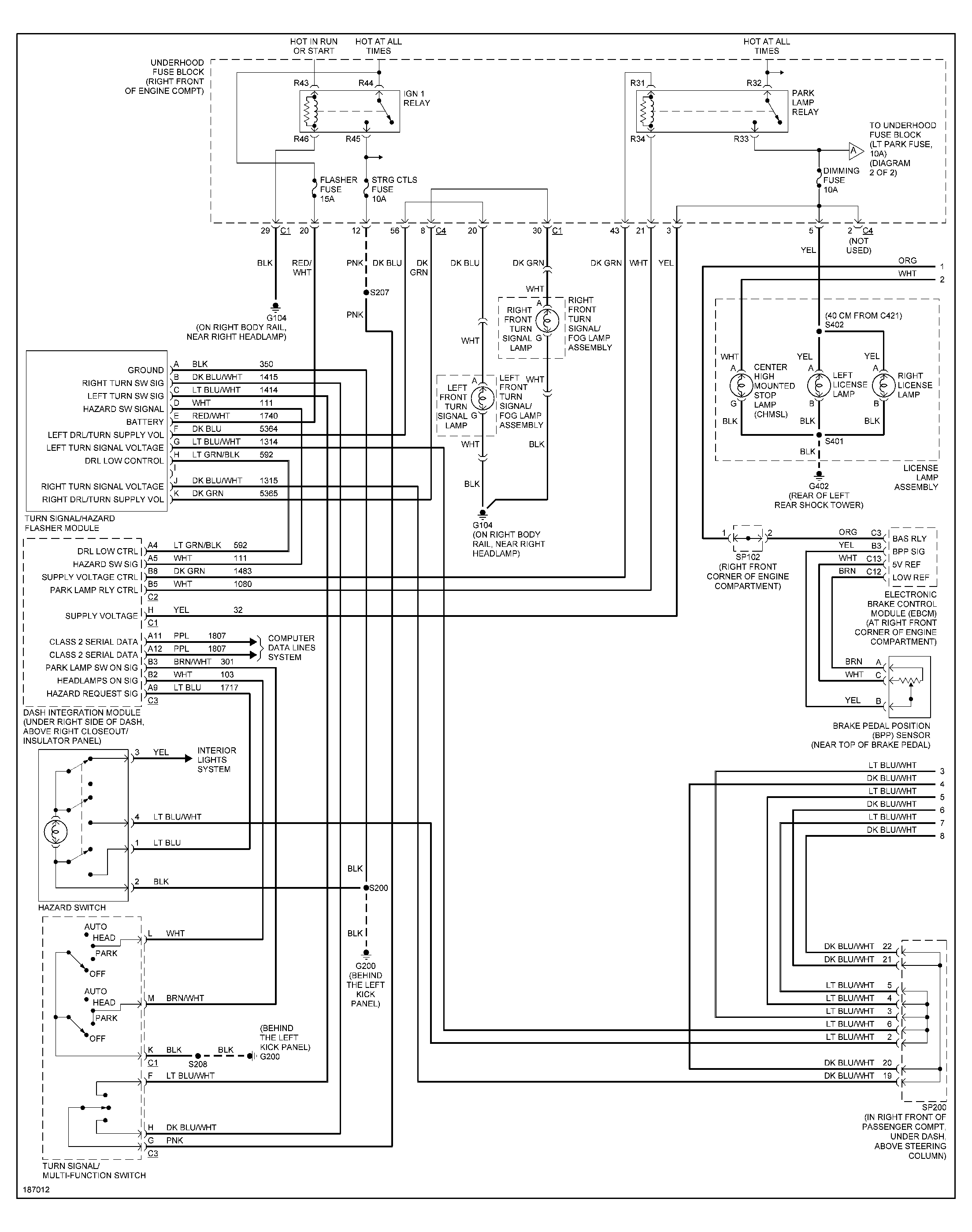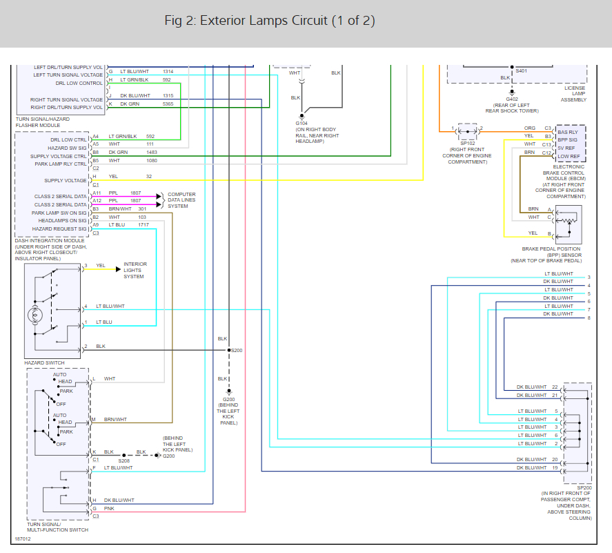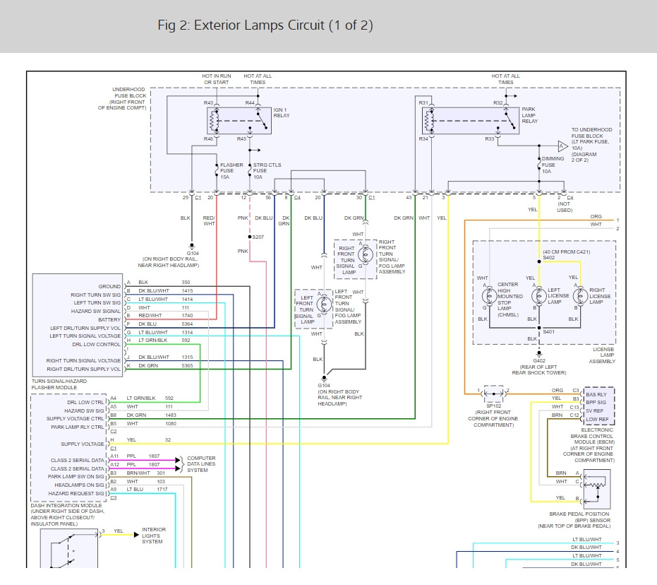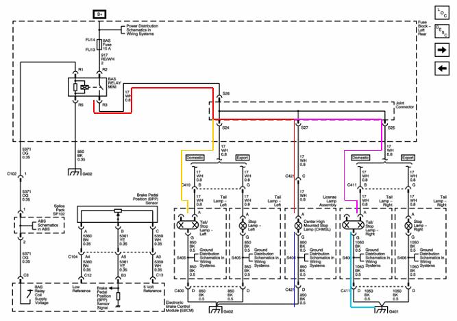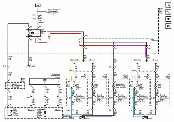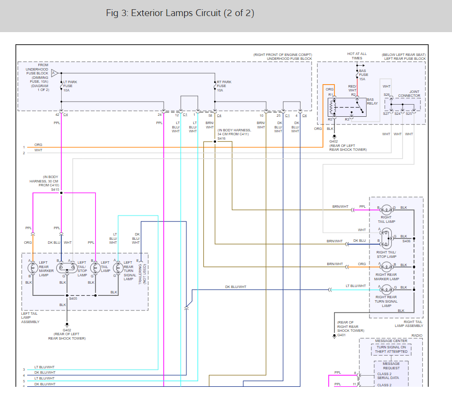 If you don't have a test lamp lit at each rear lamp(on the white wire), then trace back to the next connection, which would probably be at the rear fuse block, or that joint connector. If there is power on the appropriate circuits there, you have a wiring problem between the fuse block, and the rear lamps, on both sides. If you have power and ground at the rear connectors C411, and C410, then you either have bad sockets, or bad bulbs. Let's go back to the symptom, you DO have a high mount when the pedal is depressed, you just are lacking the right and left brake light, correct? To answer your question that you asked while I was composing this reply, you only have the one relay, labeled BAS. You should be able to locate it with the legend under the fuse box cover.