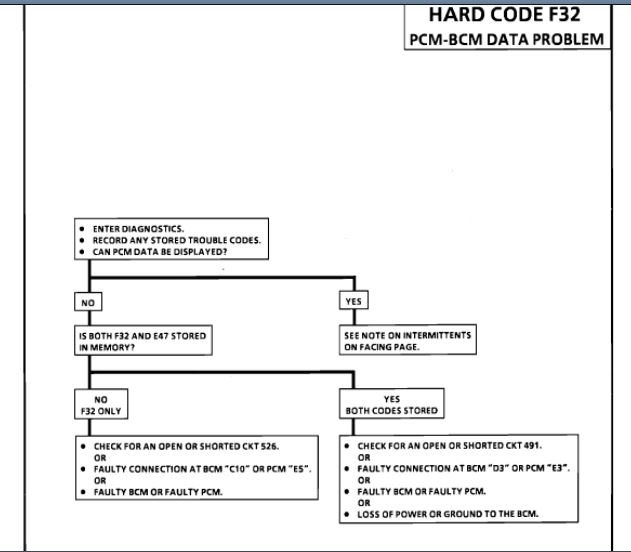 Code F32 is set by the BCM if a problem is detected transferring data back and forth to the PCM/ECM. If a hard code F32 is displayed upon entering diagnostics, one of the following conditions exist: