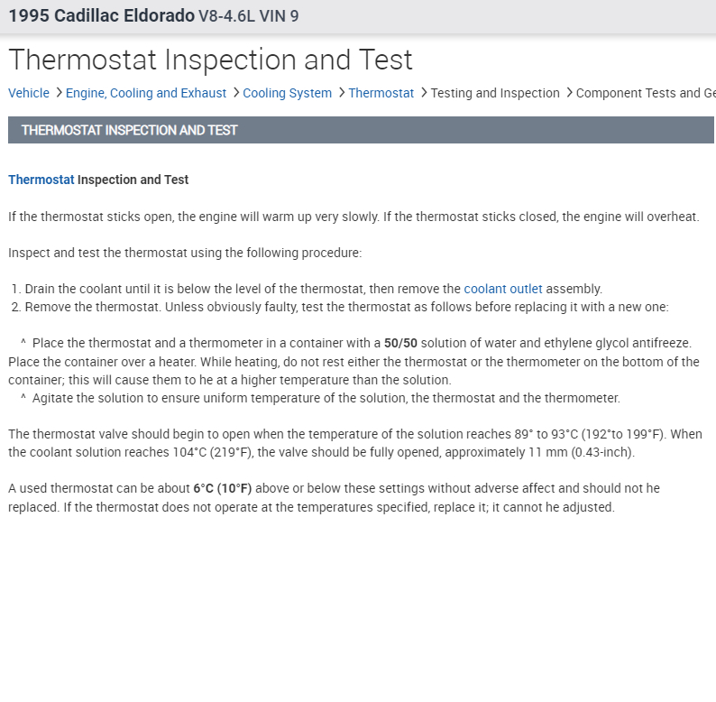 The thermostat valve should begin to open when the temperature of the coolant reaches 89° to 93°C (192°to 199°F). When the coolant reaches 104°C (219°F), the valve should be fully opened.