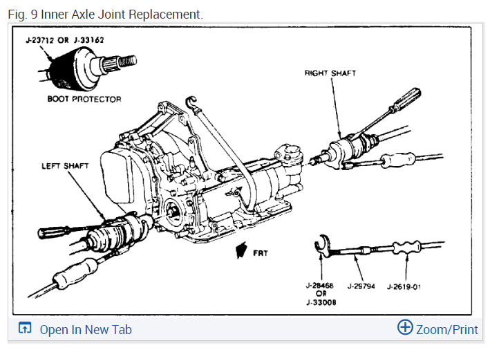 7. Remove drive axle from transaxle using axle shaft remover puller tool Nos. J-33008, J-29794 and slide hammer tool No. J-2619-01, or equivalents, if necessary, Fig. 9.