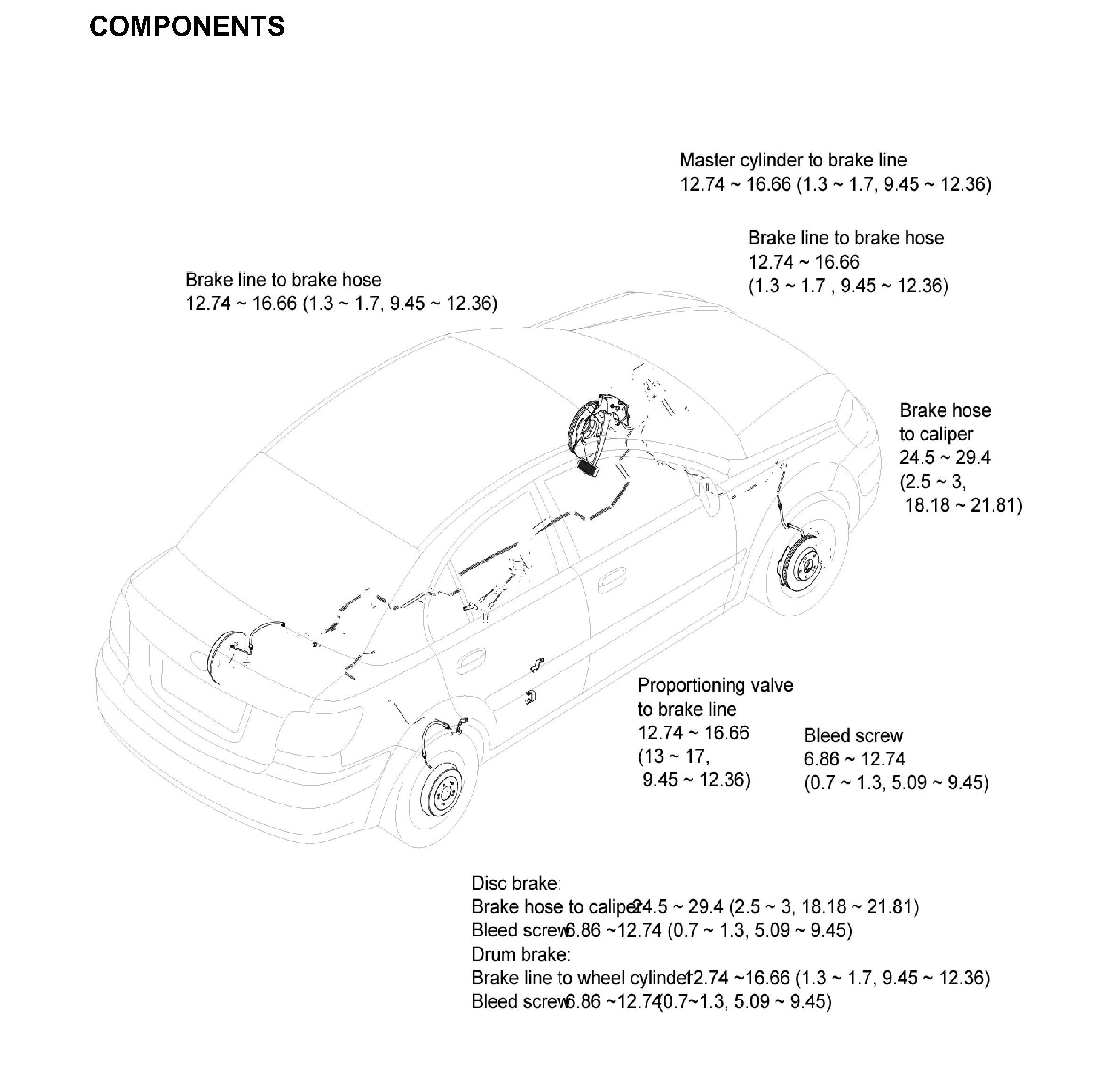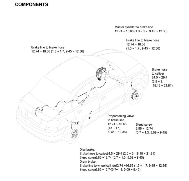 You will need to bleed the brake system if a lot of fluid is lost when removing the rubber hose. Here are the directions for all wheels. Again, as long as you don't allow the brake master cylinder to get too low, you should only have to bleed the caliper where you replaced the hose. If the master cylinder is drained, then do all 4 wheels. The remaining pics correlate with the directions.
